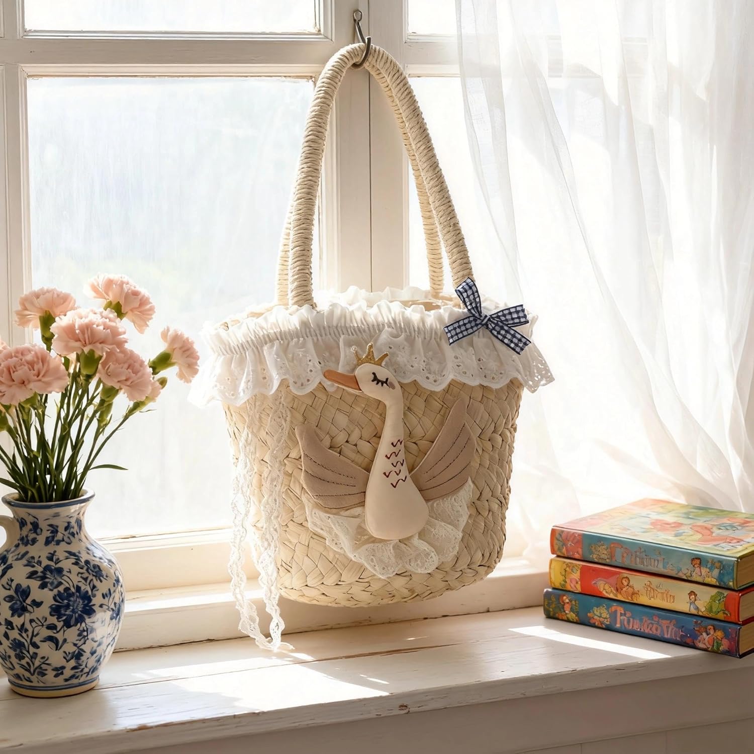 This doll embellished lace trim straw handbag is a romantic and cute item specially designed for summer.Made of premium natural straw with a soft base weaving process, it is breathable, lightweight and durable. The 3D doll embellishment + house appliqué + lace trim + bow exude a strong boho beach bag vibe—grab it and go, instantly becoming a summer vibe icon.As a straw bucket bag, its 9.4×10.6×5.1-inch capacity can hold all daily essentials. The open top + inner pocket makes accessing items easier. Its foldable feature allows it to be easily stored in backpacks or suitcases, making it an ideal companion for short trips.Whether for beach walks, garden picnics, market shopping or girlfriend dates, this woven beach bag fits perfectly. The soft base color pairs well with various summer outfits, easily enhancing the layering of your look. At the same time, it is also a heartfelt gift—sending it to important people on special festivals conveys the romance and cuteness of summer, making it a womens handbag that combines beauty and practicality.